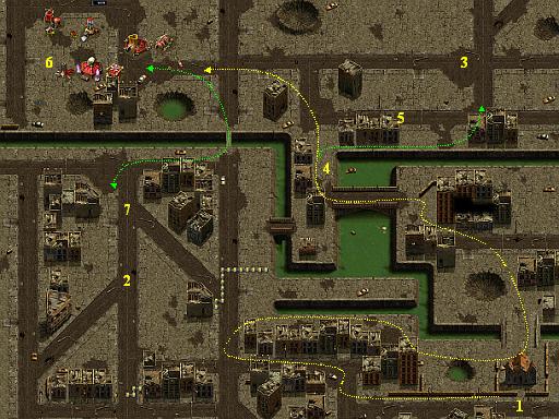 Your forces are at the point 1. Robots have a camp at the area 2 and Survivors at the area 3. Go to the point 4 and destroy the Sentry Gun at the point 5. Then, you can liquidate resources of Survivors. Avoid your units before the firing of other towers. After this, remove forces to the point 6 and build up your camp here. A Kneecapper at the entrance of the camp is sufficient for your defence. Make a group from 10 Rioters and send them to the point 7. Destroy one Windmill here and go back. Pursuers come to your tower and are shot up. This action repeat. Make next groups from 10 Rioters and 1 Death Hippo.(Note: Hippo is good against light towers.) You can stepwise destroy both camps by these groups. Then clean up the rest of the map and it is end of this mission.