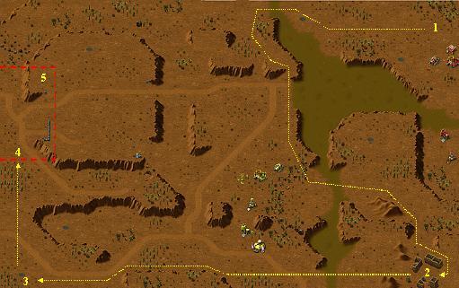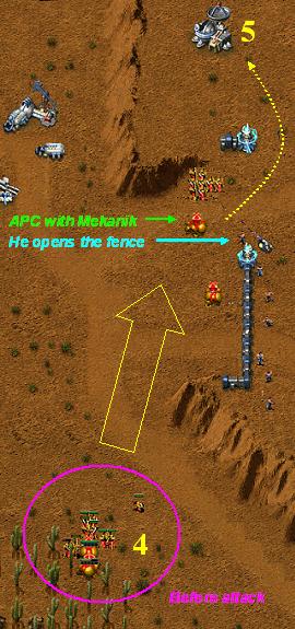 You have two Spirit Archers, six Berzerkers, one Martyr and one Mekanik at the point 1. Go to the point 2 and obtain two small APSs there. Kill all enemy infantry in your way. Move your forces to the point 3. Spirit Archers clear up this route. Wait until a big patrol pass you. Then go to the point 4. Now, you must execute the most difficult task of this mission. Your Mekanik must enter in Survivor's Research Lab (the point 5). You have a lack of time and you must go through the fence from Force Walls. You can see this situation on the Detailed map. The Mekanik is in an APC. Send all forces in front of the fence. Your infantry and remaining APC must decoy the fire of Survivors. Mekanik's APC must come through open fence and drive to the Lab. The success of described action is uncertain. Therefore, be prepared on several repetitions. When the Mekanik enter in the Lab, you obtain a strong enforcements at the point 1. Build up your camp and send remaining enforcements (two Death Hippos and two Missile Crabs) to the point 4 again. Kill all in them way. Then destroy Oil Tankers and the Force Wall. You have a free way into Survivor's camp. Destroy enemy buildings and antiaircraft forces. Make three Fighters and send them on Cannon Towers. Then clear up the rest of the map.