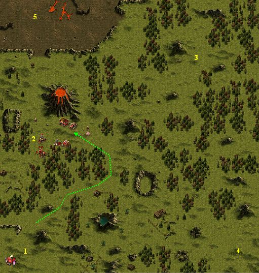 Your camp is set at the area 1. At first, you must occupy Survivor's Drill Rig at the point 2. It is defended by three towers. Your situation is complicated by Survivors in the forest and airdrops near your camp. Two Kneecappers in the entrance of the camp are good against these airdrops. Make six Rioters and Mobile Derrick. Take all your forces and destroy Survivor's towns at the area 2. Decoy their firing by your Bull Ant Tank. Then build up the Derrick there and send your Tanks with oil to the camp. Strike back attacks Survivors and robots simultaneously. The second task is the building of your camp at the area 2. Build up Warrior Halls along green line stepwise. You can gain resource units by unmaking of your unnecessary buildings. In this way, you can build up a new camp nearby your Derrick. Buid up towns in entrances. Make a group Rioters and send them to the point 3. Destroy Pod Cannon and Oilbot there. Then make the Fighter and send it to the point 4. You can destroy robot's camp there. Strengthen this attack by other Fighters and combine it with airdrop of Rioters. Clear up forest between points 3 and 4. After this, destroy Survivor's camp.