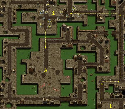 Your forces are set at the point 1. The enemy has two camps - at points 2 and 3. At first, destroy camp at the point 2 and build up your camp there. Two towers in the entrance of your camp are sufficient for defence. Destroy remaining enemy camp stepwise by airdrops. The best weapons are Michaelangelos. Discharge your Michaelangelos alongside of the target or move them behind various obstacles. You can decoy an enemy firing by another unit too - Oil Tankeroids are the most resistant. Strengthen your forces by Transport Domes. In the end, clean up the rest of the map.