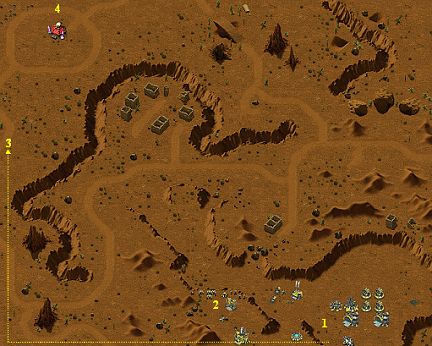You have an incomplete camp at the point 1. Move your forces to the point 2 and defend the entrance of your camp from cliffs. Remove your Power Unit closest to the Oilbot and build up complete camp with strong resources. Prepare four Spore Missiles and send them on cliffs against Wasp Bombers. Then make a Grimm Reaper and Transport Dome. Send them along yellow route to the point 3 and destroy all towers on this route. Then, you can destroy Bull Ant Tanks there. Send another Grimm and Repair Vehicle as a support there. Find out weak points in the defence of Evolved's camp and exploit them. For example, you can destroy Bazooka Batteries from the point 4. Make eight fighters and attack on enemy camp. After this, you must clean up the rest of the map. Go over these areas by fighter. All rest enemy forces come to your camp and you can destroy them easily.
