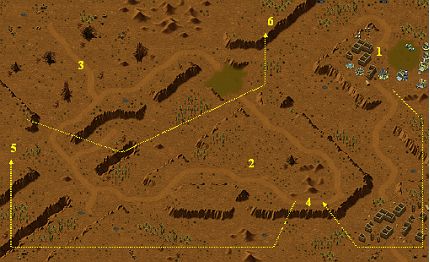 Your forces are located at the point 1. Infantry and vehicles send on cliffs and build up your camp there. You have two enemies. Evolved are located on the plane 2 and Survivors on the area 3. At the first, you must destroy their resources. Take a Grimm Reaper into a Transport Dome and send it to the point 4. You can destroy all Bull Ant Tanks here. (Hint: The enemy don't attack on the Grimm into Dome.) Then go to the point 5. Destroy all Oil Tankers here. After this, send your Grimm to the point 6. Attention on antiaircraft forces of Survivors! Destroy all Oil Tankers here too. Now, you can erase enemy camps. Combine attacks of Grimm Reapers with your Fighters.
