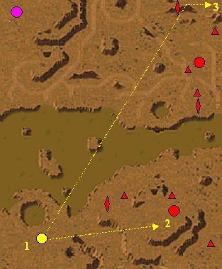 You have an uncompleted camp (the point 1) in a plateau. Build up the complete camp and ensure its defence - two Distance Seeders in the each entrance are sufficient. Send a Grim Reaper to the point 2 by air. This Reaper can destroy all infantry and animals in the enemy camp. Then destroy Bull Ant Tanks and all Bazooka Batteries (triangles on the map). Now, your Fighters can destroy the Touch of Death (rhombus on the map). Meanwhile, destroy other enemy means in this camp. At the same time, send next Grim Reaper to the point 3 by air. This Reaper can destroy all Bull Ant Tanks and all Bazooka Batteries in the north camp. Then send Fighters there and destroy all enemy towers. Strengthen your attack and destroy all another enemy means.