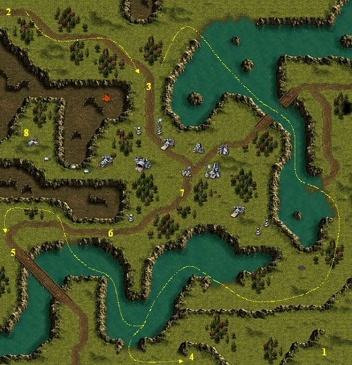 You have six infantrymen at the point 1. Destroy a Barrage Craft from cliffs and wait on reinforcements at the point 2. You get two Doom Domes. Move them to the point 3 and destroy the Drill Rig there. Then crush the Sentry Gun at the point 4 and three Sentry Guns nearby a west bridge (the area 5). You have a free way for your infantrymen. Meanwhile, you obtain another reinforcements at points 1 and 2. Now, you can attack on the west part of Survivor's camp. You must destroy Force Walls and overpower Cannon Tower (the point 6). Then Doom Domes can destroy central buildings of enemy camp (the point 7). At the same time, move infantrymen along cliffs on the left to the Drill Rig (the point 8) and destroy it together with Oil Tankers. In the end, destroy two Cannon Towers in the north and south entrances.