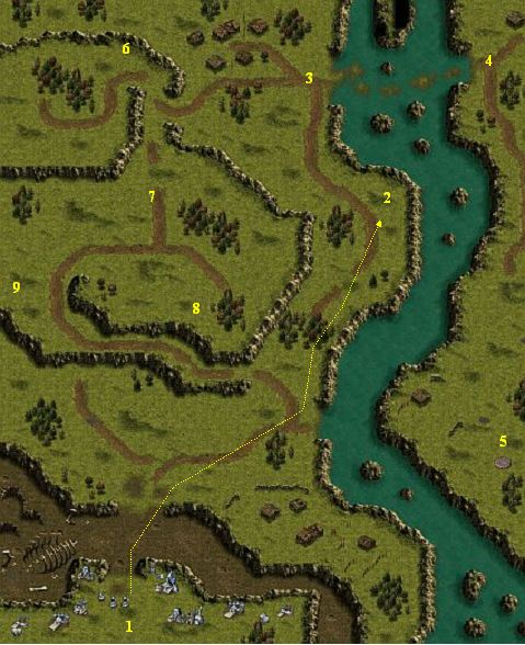 You have incomplete camp at the point 1. Complete it and build up the defence of its entrance. Make 2 Oil Tankers and another Barracks. Prepare 20 Grenadiers and 20 Flamers and send all infantrymen with one Technician to the point 2. Robots have 3 Pod Cannons at the point 3. Destroy them and move your forces to the point 4. Send the Technician to the Tech Bunker (the point 5). You obtain very good weapon - Sentinel Droid. Send the Droid to the point 6 and destroy two enemy light towers there. Move your infantry there and destroy all buildings in this area. Then destroy enemy buildings at the point 7. In the end, destroy enemy towers in areas 8 and 9. Exploit a big gun-range of your Sentinel Droid.