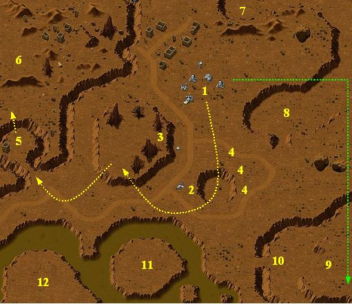 You have 3 Airlifters and incomplete camp at the point 1. Your Drill Rig is located at the point 2. Evolved have a Kneecapper at the point 3. You must drive your Tankeroids without its gunshot at the beginning. Upgrade your Barracks and make group of 5 Flamers. Send them along yellow trace by an Airlifter. Then decoy the Kneecapper by your Tankeroids. Now, your Flamers can destroy it. Crush all on plateau 3. Meanwhile, make a lot infantry - the best are Grenadiers. Locate some Grenadiers at points 4 - they decoy Series 9 to your camp 1 instead to your Drill Rig 2. Destroy their attack. Upgrade your Barracks and make Kamikazes. Meanwhile, send group of Flamers to the point 5 and destroy the Bazooka Battery there. Now, you have a free way to the camp of Evolved (point 6). Destroy all in this area. Two Grenadiers can destroy the Bull Ant Tank at the point 7 from cliffs. The camp of Evolved at the point 8 is without resources now. Next task is destroying of the camp of Series 9 at the point 9. Send Kamikazes along green trace by Airlifter. You can stepwise destroy enemy buildings there. Send 30 Grenadiers to the point 10 and destroy 3 Distance Seeders there. Then clear up entire area 9. The last tasks are to occupy islands 11 and 12. The best are airdrops of Kamikazes and Laser Troopers.