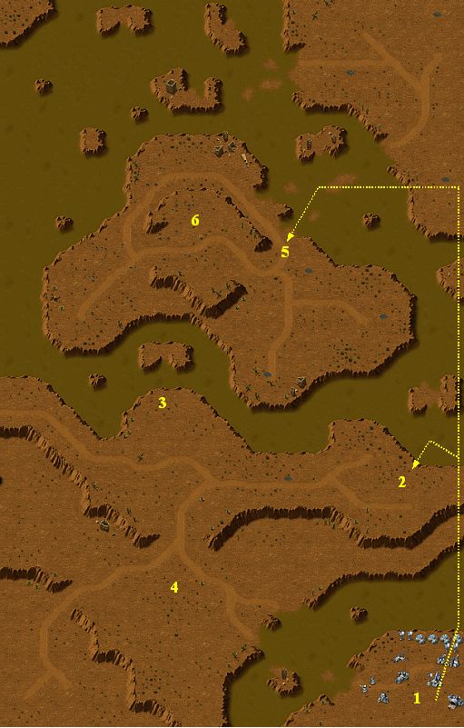 Your forces are located at the point 1. At first, build up a camp with strong resources. After this, send a Juggernaught to the point 2 by air. This combat vehicle can destroy the most east Bazooka Battery and you obtain free air corridor to the North. Strengthen your airdrop and send your forces to the point 3. Destroy all units, towers and Bull Ant Tanks there. Fighters are the best weapons against Touches of Death. After this, attack and destroy entire base in the area 4. Then, send three Juggernaughts to the point 5. Shoot up the big group of Bazookoids at the point 6 (see picture). Then destroy stepwise entire enemy camp. Combine Juggernaught fires with attacks of Fighters.